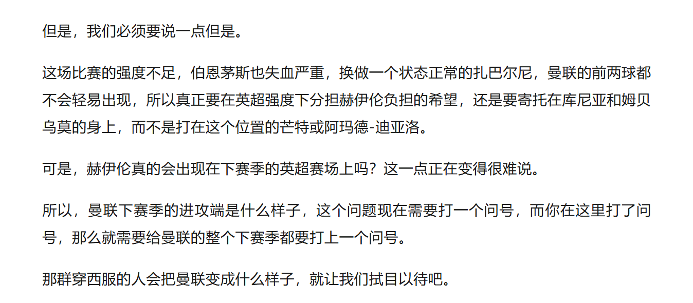 在这种情况下,曼联才有可能摸到自己的成绩上限,这也就是我们在上一场比赛后所说的:‘曼联下赛季的进攻端是什么样子,这个问题现在需要打一个问号,而你在这里打了问号,那么就需要给曼联的整个赛季都要打上一个问号。’