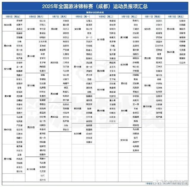 据央视体育消息,2025年全国游泳锦标赛将于9月5日至12日在成都举行,汪顺、潘展乐、徐嘉余、张雨霏、余依婷等名将都将参赛。根据目前报项情况,汪顺将参加100米蛙泳和100米自由泳,潘展乐将参加50米蝶泳和100米蝶泳。本次比赛是新加坡游泳世锦赛后国内重要的游泳赛事,同时也是第十五届全运会资格选拔赛。